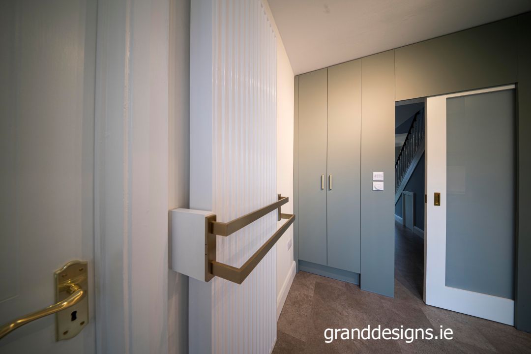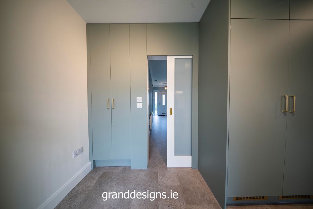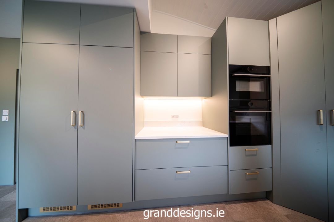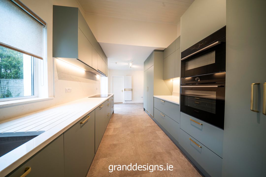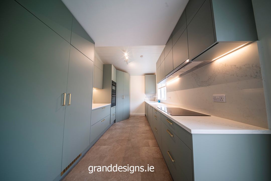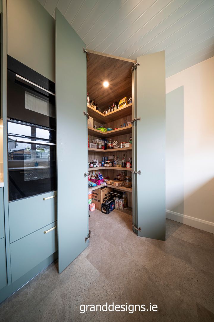 A contemporary galley kitchen with bespoke solutions for a clutter free cooking experience. The colour brings joy to the space and the light coloured stone worktop add architectural elegance. Under-mounted sink, induction hob and stacked appliances make the kitchen easy to clean. The walk-in pantry give ample storage and easy access for your non-perishable dry goods as well as larger kitchen equipments.